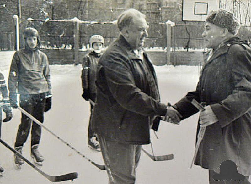 Заслуженный тренер СССР по хоккею с шайбой, дважды Кавалер Ордена Трудового Красного Знамени, основатель турнира "Золотая Шайба", Анатолий Владимирович Тарасов (слева) вручает сувенирную клюшку с автографами наших хоккеистов сыну легендарного комдива Василия Ивановича Чапаева, заместителю начальника артиллерии Московского военного округа, генерал-майору Александру Васильевичу Чапаеву. Середина 70-х годов, Москва.